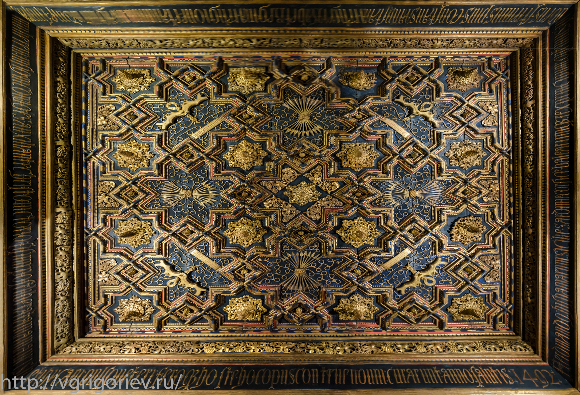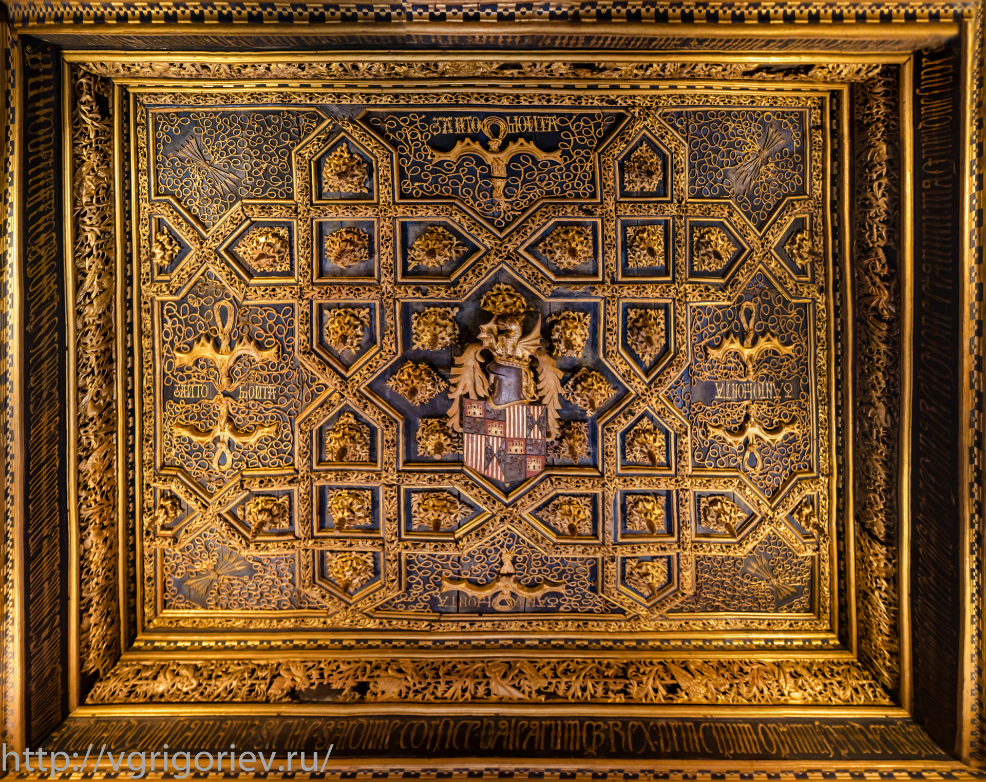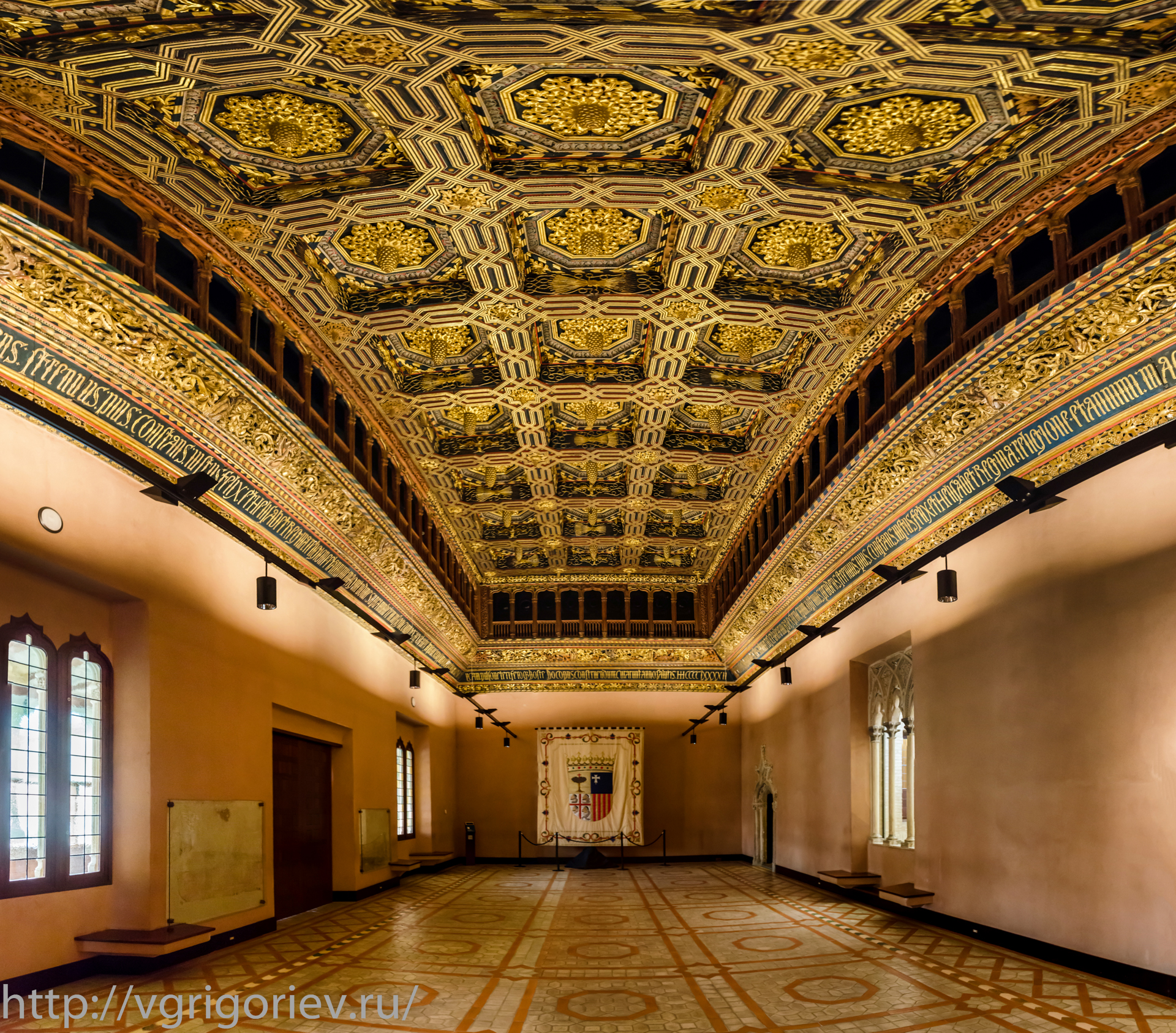 Одно из особенностей, чем отличается Альхаферия, — позолоченные резные потолки залов второго этажа, прекрасно сохранившиеся до наших дней. Фотографии получились не идеальными, но, учитывая немалые размеры самих помещений, на каждую и так понадобилось по 5-6 часов на обработку и выравнивание.