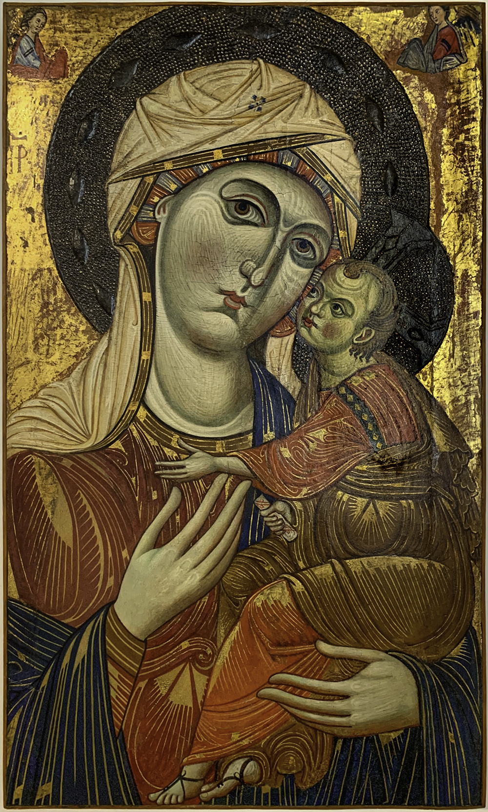 Мадонна с Младенцем (Мадонна деи Мантеллини) (Джилио ди Пьетро или Мастер святых Космы и Дамиана, XV в.). Темпера по дереву, 78×49 см. Оригинальная работа сейчас хранится в Сиенской Пинакотеке. В церкви мы можем увидеть только копию почитаемой иконы, вставленную в скинию (тосканская мастерская, XVII в.). Изображение в византийском стиле пользовалось народным благочестием, являясь центром молитв за младенцев и новорожденных (которых пеленали в «Мантеллини»), и дало название району и улице. Поза Девы Марии, держащей Младенца в правой руке, заимствована из модели одигитрии, часто встречающейся в Сиене. Однако фигура Младенца Иисуса обычно вызывает недоумение у неподготовленного глаза: по форме он больше похож на миниатюрного взрослого, чем на маленького ребенка, обычно пухлого, как ангел, лысого с самого раннего возраста и смотрящего на свою мать глубоким, вопрошающим взглядом, больше подобающим взрослому, Младенец Иисус таким образом выражал свою божественную природу в глазах верующих, для которых этот образ предназначался в конце XIII в. Мы должны взглянуть на этого ребенка взглядом, свободным от наших собственных культурных предрассудков, спустя 800 лет, чтобы понять глубокий смысл изображения, которое должно было раскрыть, «сделать видимым», божественную природу существа, находящегося на руках у Матери. Именно игра на аномалиях, а также на сходстве, граничащем с несходством, позволила выразить сверхъестественный характер Иисуса в живописи в то время, когда она была одновременно средством выражения и способом обучения. Два крошечных, несоразмерных ангела, расположенные в верхних углах, с руками, протянутыми к Иисусу и почтительно прикрытыми краями своих плащей, чтобы избежать прямого контакта, словно ждут, чтобы деликатно взять в руки того, кого они, со своей стороны, сразу узнали.