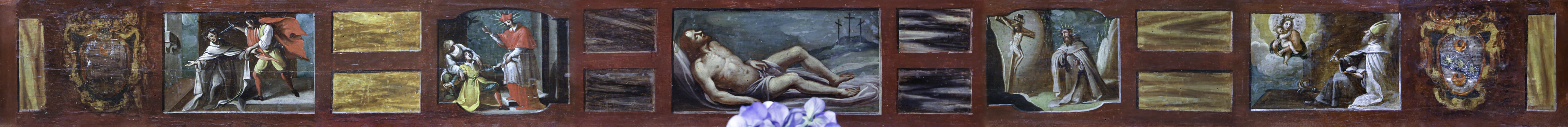 Пределла к алтарному образу, включающая пять панелей, написана Стефано Вольпи. На панелях, относящихся к началу XVII в., изображены мертвый Иисус в центре и четыре истории о святых-кармелитах. На концах пределы герб семьи Джунти.